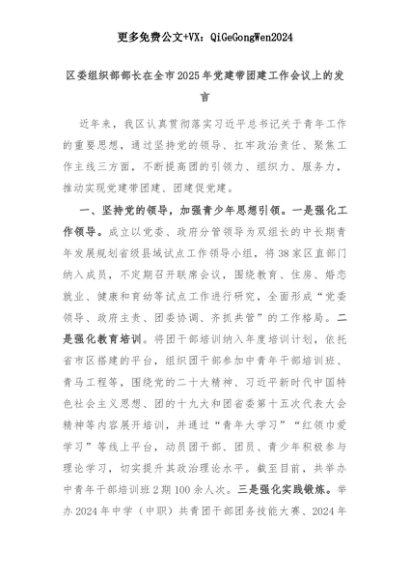【七哥公文】2025年:区委组织部部长在全市2025年党建带团建工作会议上的发言+更多免费公文+VX:QiGeGongWen2024+更多免费公文+VX:QiGeGongWen2024
