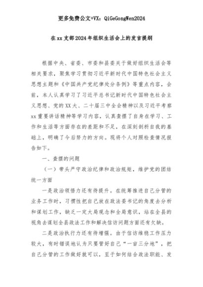 【七哥公文】2025年:在xx支部2024年组织生活会上的发言提纲+更多免费公文+VX:QiGeGongWen2024+更多免费公文+VX:QiGeGongWen2024