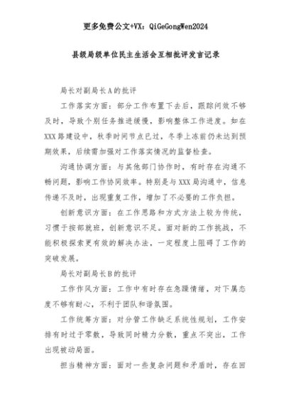 【七哥公文】2025年:县级局级单位民主生活会互相批评发言记录+更多免费公文+VX:QiGeGongWen2024+更多免费公文+VX:QiGeGongWen2024