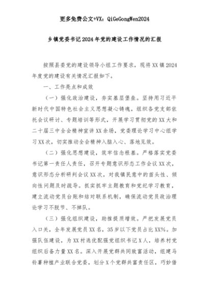 【七哥公文】2025年:乡镇党委书记2024年党的建设工作情况的汇报+更多免费公文+VX:QiGeGongWen2024+更多免费公文+VX:QiGeGongWen2024