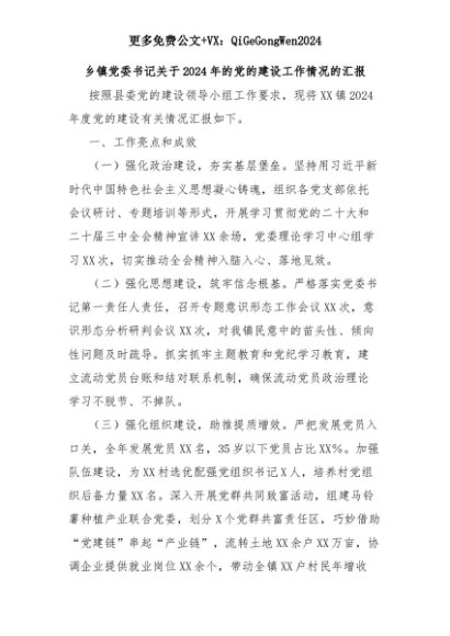 【七哥公文】2025年:乡镇党委书记关于2024年的党的建设工作情况的汇报+更多免费公文+VX:QiGeGongWen2024+更多免费公文+VX:QiGeGongWen2024