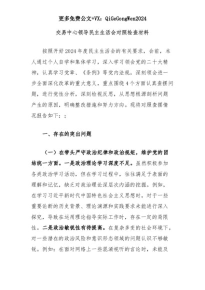 【七哥公文】2025年:交易中心领导民主生活会对照检查材料+更多免费公文+VX:QiGeGongWen2024+更多免费公文+VX:QiGeGongWen2024