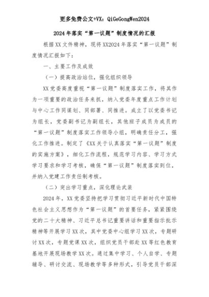 【七哥公文】2025年:2024年落实“第一议题”制度情况的汇报+更多免费公文+VX:QiGeGongWen2024+更多免费公文+VX:QiGeGongWen2024
