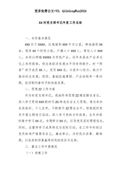 【七哥公文】2025年:XX村党支部书记年度工作总结+更多免费公文+VX:QiGeGongWen2024+更多免费公文+VX:QiGeGongWen2024