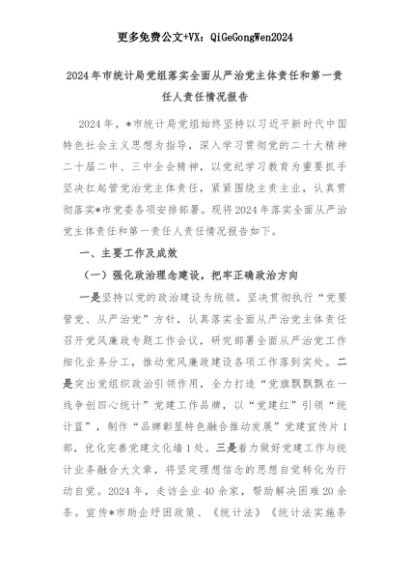 【七哥公文】2025年:2024年市统计局党组落实全面从严治党主体责任和第一责任人责任情况报告+更多免费公文+VX:QiGeGongWen2024+更多免费公文+VX:QiGeGongWen2024