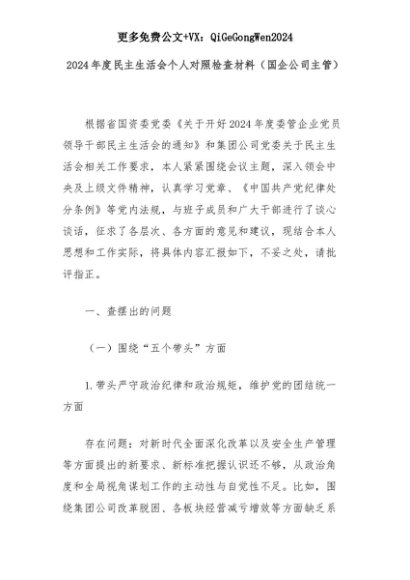 【七哥公文】2025年:2024年度民主生活会个人对照检查材料(国企公司主管)+更多免费公文+VX:QiGeGongWen2024+更多免费公文+VX:QiGeGongWen2024
