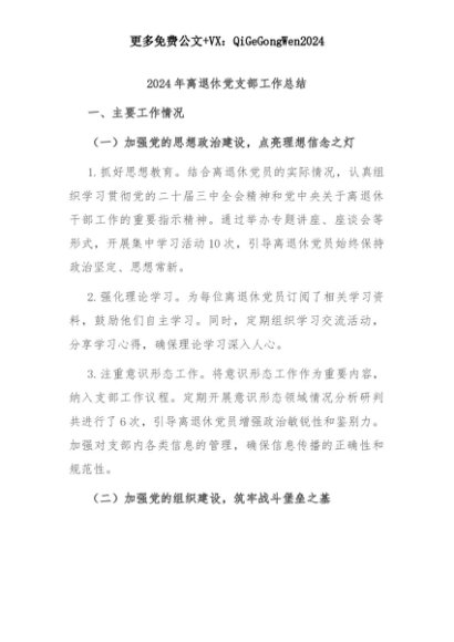 【七哥公文】2025年:2024年离退休党支部工作总结+更多免费公文+VX:QiGeGongWen2024+更多免费公文+VX:QiGeGongWen2024