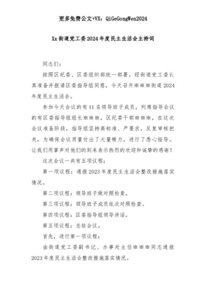 【七哥公文】2025年:Xx街道党工委2024年度民主生活会主持词+更多免费公文+VX:QiGeGongWen2024+更多免费公文+VX:QiGeGongWen2024