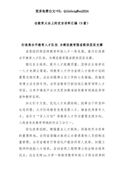 【七哥公文】2025年:(9篇)在教育大会上的发言材料汇编+更多免费公文+VX:QiGeGongWen2024+更多免费公文+VX:QiGeGongWen2024