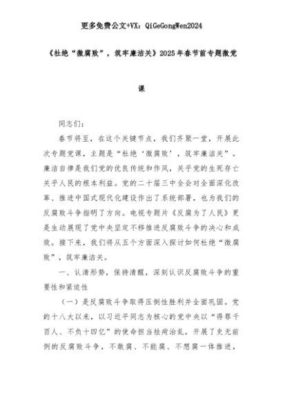 【七哥公文】2025年:《杜绝“微腐败”,筑牢廉洁关》2025年春节前专题微党课+更多免费公文+VX:QiGeGongWen2024+更多免费公文+VX:QiGeGongWen2024