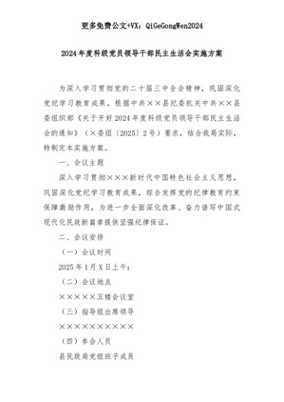 【七哥公文】2025年:2024年度科级党员领导干部民主生活会实施方案+更多免费公文+VX:QiGeGongWen2024+更多免费公文+VX:QiGeGongWen2024