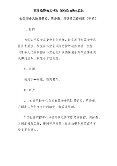 【七哥公文】2025年:食品安全风险日管控、周排查、月调度工作制度(学校)+更多免费公文+VX:QiGeGongWen2024+更多免费公文+VX:QiGeGongWen2024