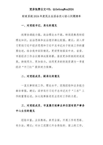 【七哥公文】2025年:财政系统2024年度民主生活会交心谈心问题清单+更多免费公文+VX:QiGeGongWen2024+更多免费公文+VX:QiGeGongWen2024