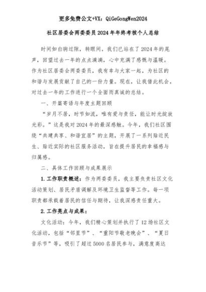【七哥公文】2025年:社区居委会两委委员2024年年终考核个人总结+更多免费公文+VX:QiGeGongWen2024+更多免费公文+VX:QiGeGongWen2024
