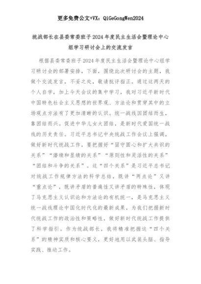 【七哥公文】2025年:统战部长在县委常委班子2024年度民主生活会暨理论中心组学习研讨会上的交流发言+更多免费公文+VX:QiGeGongWen2024+更多免费公文+VX:QiGeGongWen2024