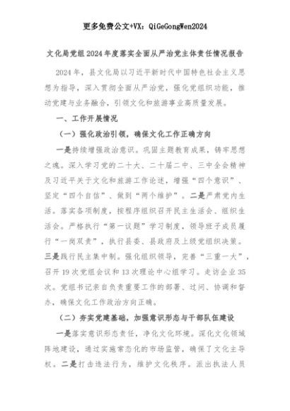 【七哥公文】2025年:文化局党组2024年度落实全面从严治党主体责任情况报告+更多免费公文+VX:QiGeGongWen2024+更多免费公文+VX:QiGeGongWen2024