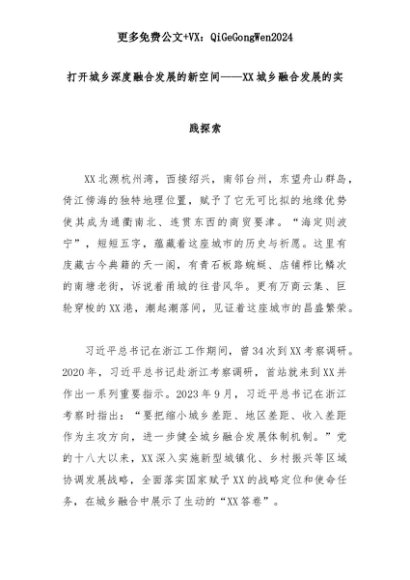 【七哥公文】2025年:打开城乡深度融合发展的新空间——XX城乡融合发展的实践探索+更多免费公文+VX:QiGeGongWen2024+更多免费公文+VX:QiGeGongWen2024