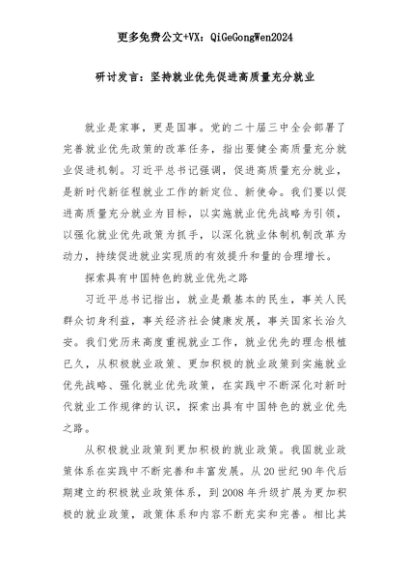 【七哥公文】2025年:研讨发言:坚持就业优先促进高质量充分就业+更多免费公文+VX:QiGeGongWen2024+更多免费公文+VX:QiGeGongWen2024