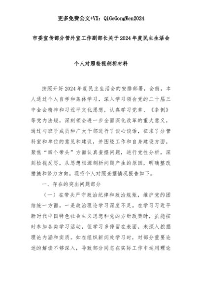 【七哥公文】2025年:市委宣传部分管外宣工作副部长关于2024年度民主生活会个人对照检视剖析材料+更多免费公文+VX:QiGeGongWen2024+更多免费公文+VX:QiGeGongWen2024