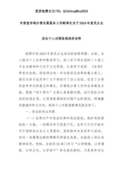 【七哥公文】2025年:市委宣传部分管志愿服务工作副部长关于2024年度民主生活会个人对照检视剖析材料+更多免费公文+VX:QiGeGongWen2024+更多免费公文+VX:QiGeGongWen2024