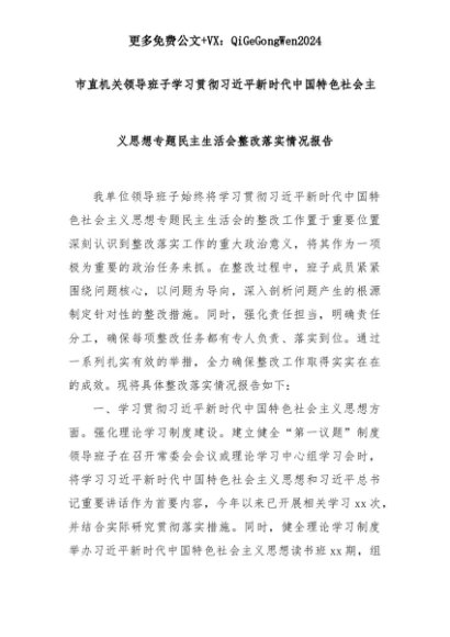 【七哥公文】2025年:市直机关领导班子学习贯彻习近平新时代中国特色社会主义思想专题民主生活会整改落实情况报告+更多免费公文+VX:QiGeGongWen2024+更多免费公文+VX:QiGeGongWen2024