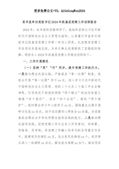 【七哥公文】2025年:某市直单位党组书记2024年抓基层党建工作述职报告+更多免费公文+VX:QiGeGongWen2024+更多免费公文+VX:QiGeGongWen2024