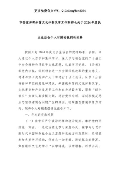 【七哥公文】2025年:市委宣传部分管文化体制改革工作副部长关于2024年度民主生活会个人对照检视剖析材料+更多免费公文+VX:QiGeGongWen2024+更多免费公文+VX:QiGeGongWen2024