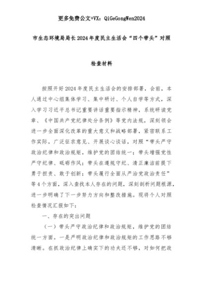 【七哥公文】2025年:市生态环境局局长2024年度民主生活会“四个带头”对照检查材料+更多免费公文+VX:QiGeGongWen2024+更多免费公文+VX:QiGeGongWen2024