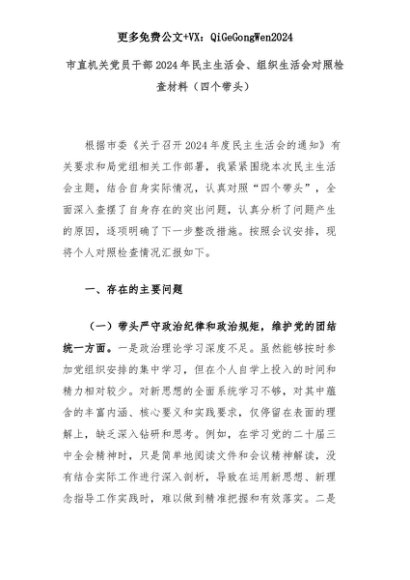 【七哥公文】2025年:市直机关党员干部2024年民主生活会、组织生活会对照检查材料(四个带头)+更多免费公文+VX:QiGeGongWen2024+更多免费公文+VX:QiGeGongWen2024