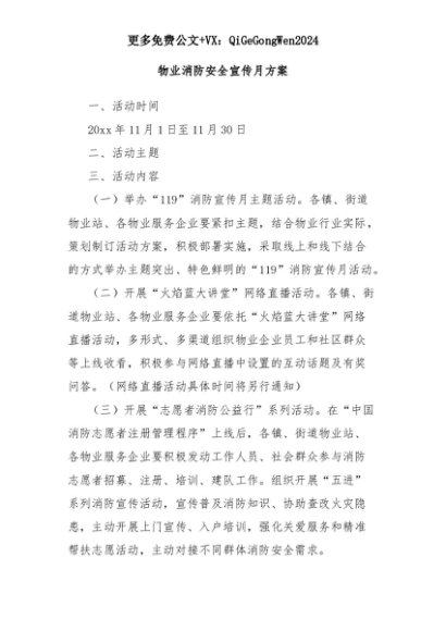 【七哥公文】2025年:物业消防安全宣传月方案+更多免费公文+VX:QiGeGongWen2024+更多免费公文+VX:QiGeGongWen2024