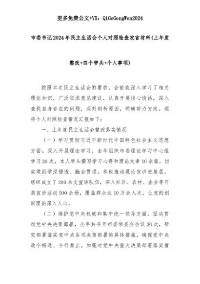 【七哥公文】2025年:市委书记2024年民主生活会个人对照检查发言材料(上年度整改+四个带头+个人事项)+更多免费公文+VX:QiGeGongWen2024+更多免费公文+VX:QiGeGongWen2024
