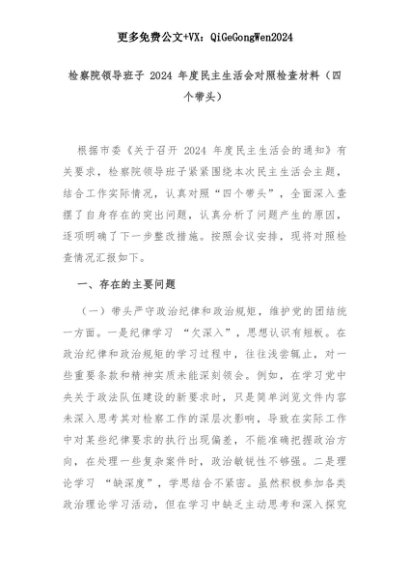 【七哥公文】2025年:检察院领导班子 2024 年度民主生活会对照检查材料(四个带头)+更多免费公文+VX:QiGeGongWen2024+更多免费公文+VX:QiGeGongWen2024