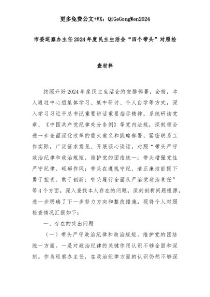 【七哥公文】2025年:市委巡察办主任2024年度民主生活会“四个带头”对照检查材料+更多免费公文+VX:QiGeGongWen2024+更多免费公文+VX:QiGeGongWen2024