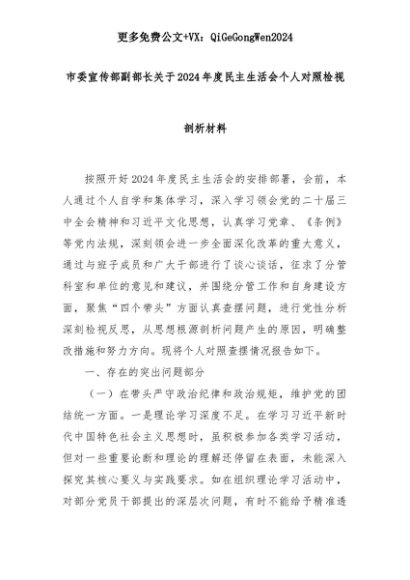 【七哥公文】2025年:市委宣传部副部长关于2024年度民主生活会个人对照检视剖析材料+更多免费公文+VX:QiGeGongWen2024+更多免费公文+VX:QiGeGongWen2024