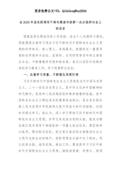 【七哥公文】2025年:在2025年县处级领导干部专题读书班第一次分组研讨会上的发言+更多免费公文+VX:QiGeGongWen2024+更多免费公文+VX:QiGeGongWen2024