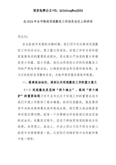 【七哥公文】2025年:在2024年全市推进巡视整改工作动员会议上的讲话+更多免费公文+VX:QiGeGongWen2024+更多免费公文+VX:QiGeGongWen2024