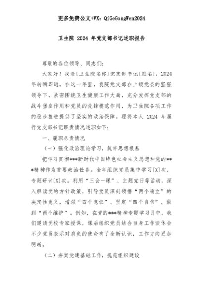 【七哥公文】2025年:卫生院 2024 年党支部书记述职报告+更多免费公文+VX:QiGeGongWen2024+更多免费公文+VX:QiGeGongWen2024