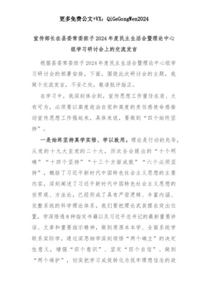 【七哥公文】2025年:宣传部长在县委常委班子2024年度民主生活会暨理论中心组学习研讨会上的交流发言+更多免费公文+VX:QiGeGongWen2024+更多免费公文+VX:QiGeGongWen2024