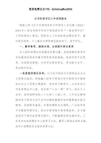 【七哥公文】2025年:公司纪委书记三年述职报告+更多免费公文+VX:QiGeGongWen2024+更多免费公文+VX:QiGeGongWen2024