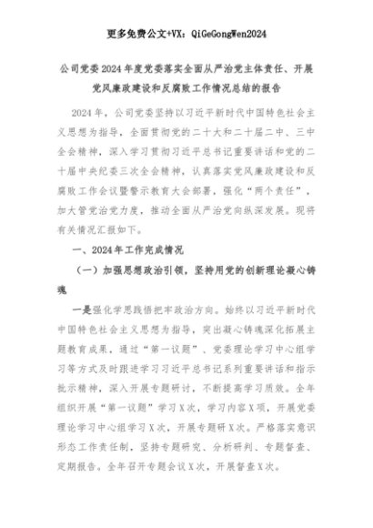 【七哥公文】2025年:公司党委2024年度党委落实全面从严治党主体责任、开展党风廉政建设和反腐败工作情况总结的报告+更多免费公文+VX:QiGeGongWen2024+更多免费公文+VX:QiGeGongWen2024