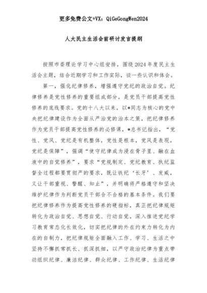 【七哥公文】2025年:人大民主生活会前研讨发言提纲+更多免费公文+VX:QiGeGongWen2024+更多免费公文+VX:QiGeGongWen2024