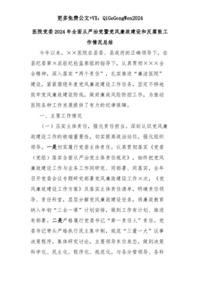【七哥公文】2025年:医院党委2024年全面从严治党暨党风廉政建设和反腐败工作情况总结+更多免费公文+VX:QiGeGongWen2024+更多免费公文+VX:QiGeGongWen2024