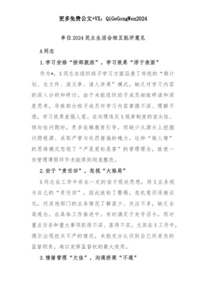 【七哥公文】2025年:单位2024民主生活会相互批评意见+更多免费公文+VX:QiGeGongWen2024+更多免费公文+VX:QiGeGongWen2024