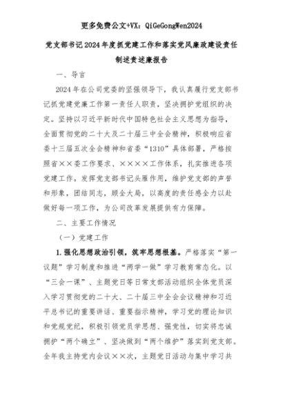 【七哥公文】2025年:党支部书记2024年度抓党建工作和落实党风廉政建设责任制述责述廉报告+更多免费公文+VX:QiGeGongWen2024+更多免费公文+VX:QiGeGongWen2024