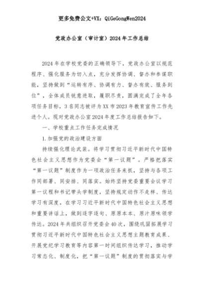 【七哥公文】2025年:党政办公室(审计室)2024年工作总结+更多免费公文+VX:QiGeGongWen2024+更多免费公文+VX:QiGeGongWen2024