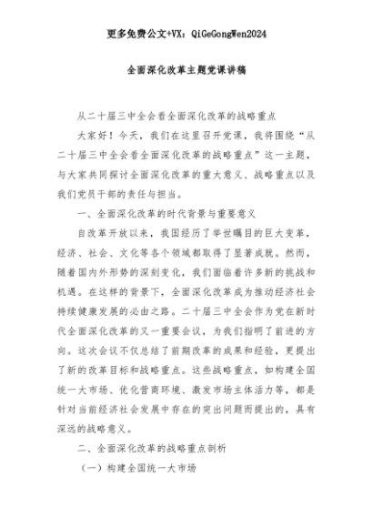 【七哥公文】2025年:全面深化改革主题党课讲稿+更多免费公文+VX:QiGeGongWen2024+更多免费公文+VX:QiGeGongWen2024