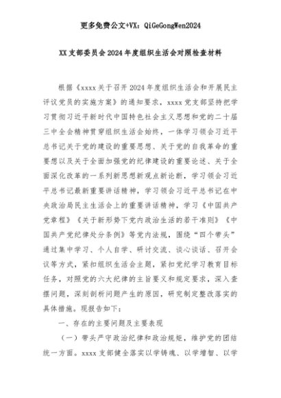 【七哥公文】2025年:XX支部委员会2024年度组织生活会对照检查材料+更多免费公文+VX:QiGeGongWen2024+更多免费公文+VX:QiGeGongWen2024