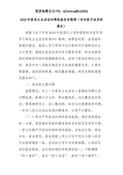 【七哥公文】2025年:2024年度民主生活会对照检查发言提纲(含对班子成员的意见)+更多免费公文+VX:QiGeGongWen2024+更多免费公文+VX:QiGeGongWen2024