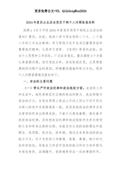 【七哥公文】2025年:2024年度民主生活会党员干部个人对照检查材料+更多免费公文+VX:QiGeGongWen2024+更多免费公文+VX:QiGeGongWen2024