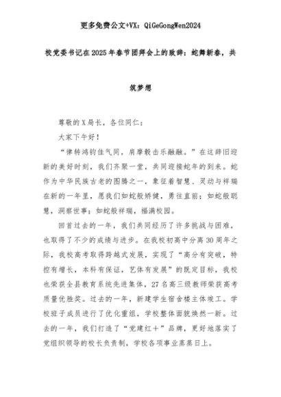 【七哥公文】2025年:校党委书记在2025年春节团拜会上的致辞:蛇舞新春,共筑梦想+更多免费公文+VX:QiGeGongWen2024+更多免费公文+VX:QiGeGongWen2024